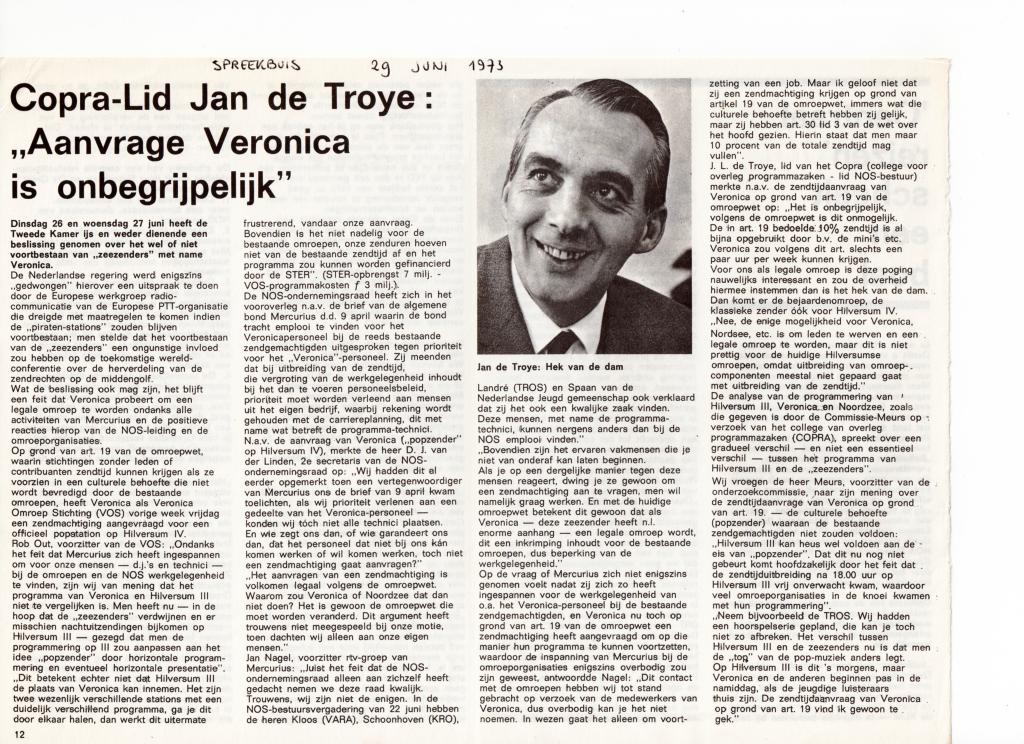 In de editie van Spreekbuis van 29 juni 1973 uitte Copra-lid en NOS-bestuurslid Jan de Troye felle kritiek op de aanvraag van Veronica om als officiële omroep erkend te worden. In de jaren zeventig was het Copra het gezamenlijke overlegorgaan van de omroepverenigingen binnen de NOS, die toen nog de coördinerende rol vervulde die tegenwoordig door de NPO wordt uitgevoerd.