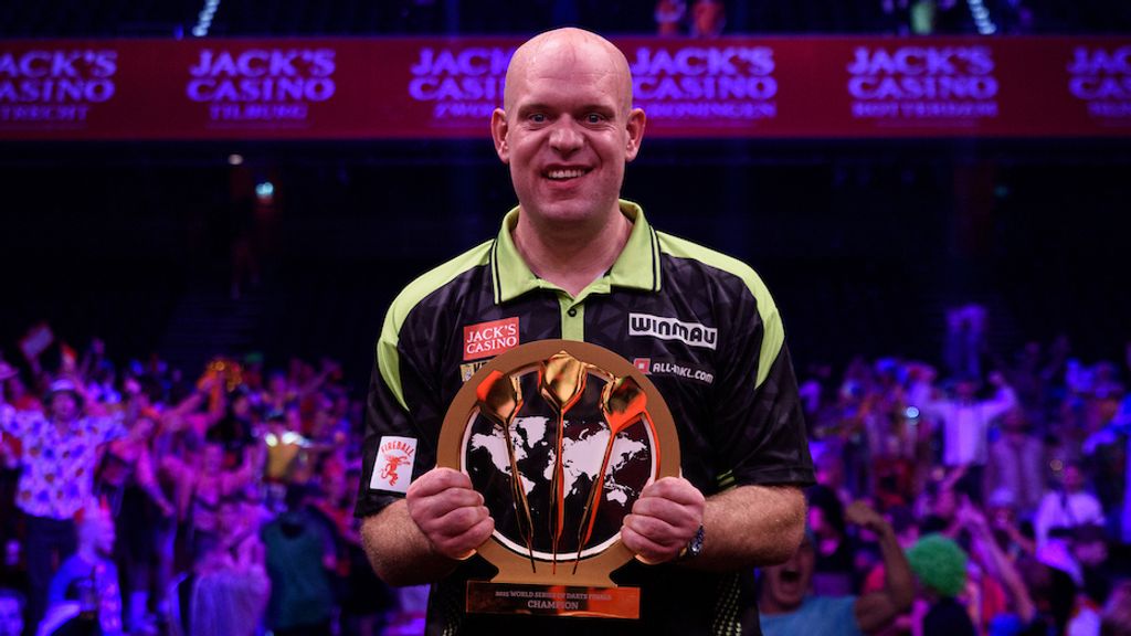 PDC / Kelly DeckersMichael van Gerwen met zijn gewonnen trofee bij de World Series of Darts Finals