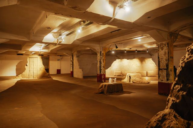 In de pokdalige ruimtes van Brutus tref je een groot aantal van dit soort driedimensionale interieurs aan, vergezeld door een schitterend gedicht van Mohammadi zelf en een videofilm waarin je de kunstenaar zand ziet zeven – meditatief, eindeloos en volhardend, zoals de mensen die wachten op een asielstatus. Het geluid van een naaimachine ratelt op de achtergrond. Er is een golfplaten schuur, een secuur uitgelichte bank met kussens en kleden, een kast met een paar kopjes en borden, brokkelige muren, en ook over de bodem spreidt het werk zich uit. De stukken zien eruit als geesten van zand, meel en water, en hun fundamenten spreiden zich uit over de vloer: kwetsbaar en wegwaaiend bij een grote windvlaag. Dus loop je voorzichtig, dus raak je één seconde zacht aan.