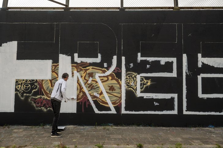 BREDA – Begin oktober werd de zin ‘Free Today, Free Forever | Vandaag vrij, altijd vrij’ vereeuwigd op een muur aan de Markkade in Breda. In totaal werkten ruim 60 vrijwilligers samen om in 16 uur een 105 meter lange en 6 meter hoge, tijdelijke muurschildering te realiseren. De tekst is ontleend aan het werk van Surinaamse schrijver, verzetsstrijder en antikoloniaal activist Anton de Kom (1898–1945) en staat symbool voor de voortdurende strijd voor vrijheid en rechtvaardigheid.