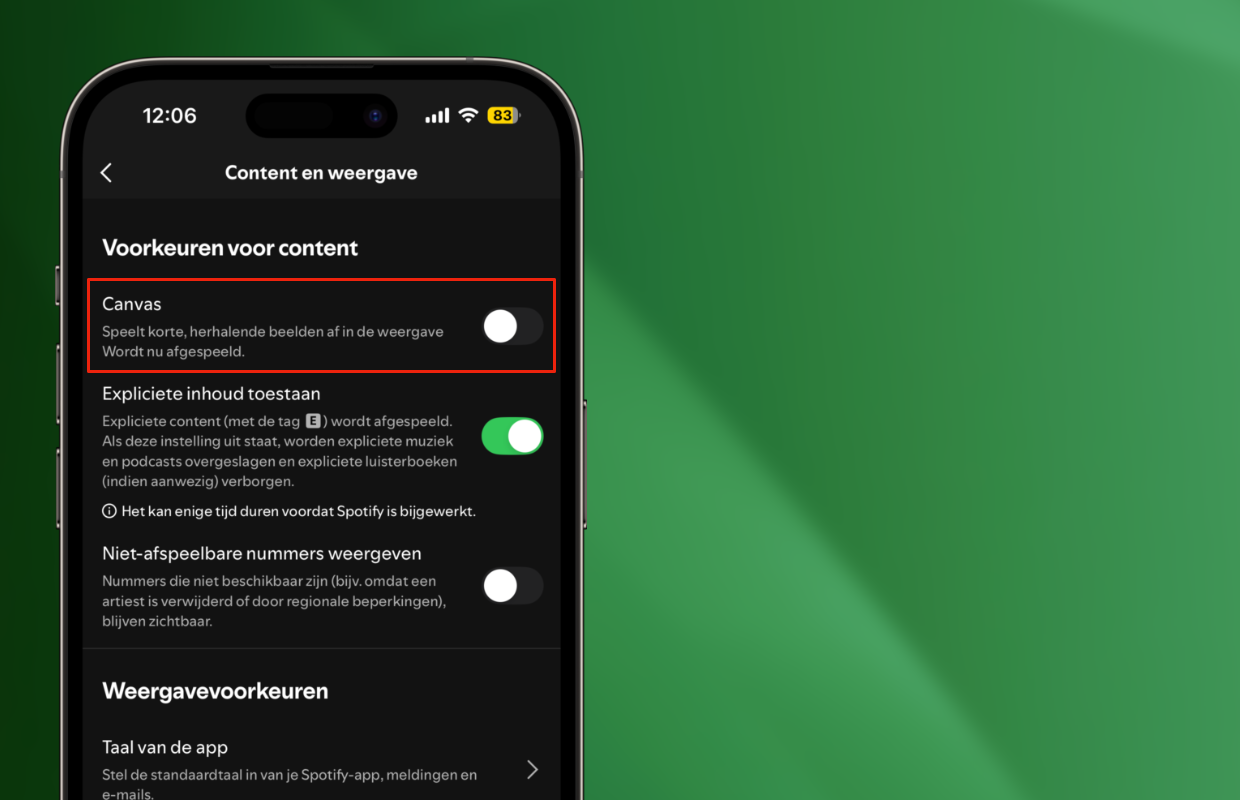 Dat zijn doorgaans beelden uit de videoclip van het nummer of korte filmpjes van de artiest. Canvas staat standaard aan in Spotify, waardoor het verstandig is om de feature uit te schakelen. Het vertonen van video’s kost meer mobiele data, waardoor je mogelijk (te) snel door je mobiele abonnement gaat. Daarnaast verbruikt je iPhone meer energie, met als gevolg dat het toestel sneller aan de lader moet. Wil je dat voorkomen? Het uitschakelen van de Spotify-functie gaat als volgt: