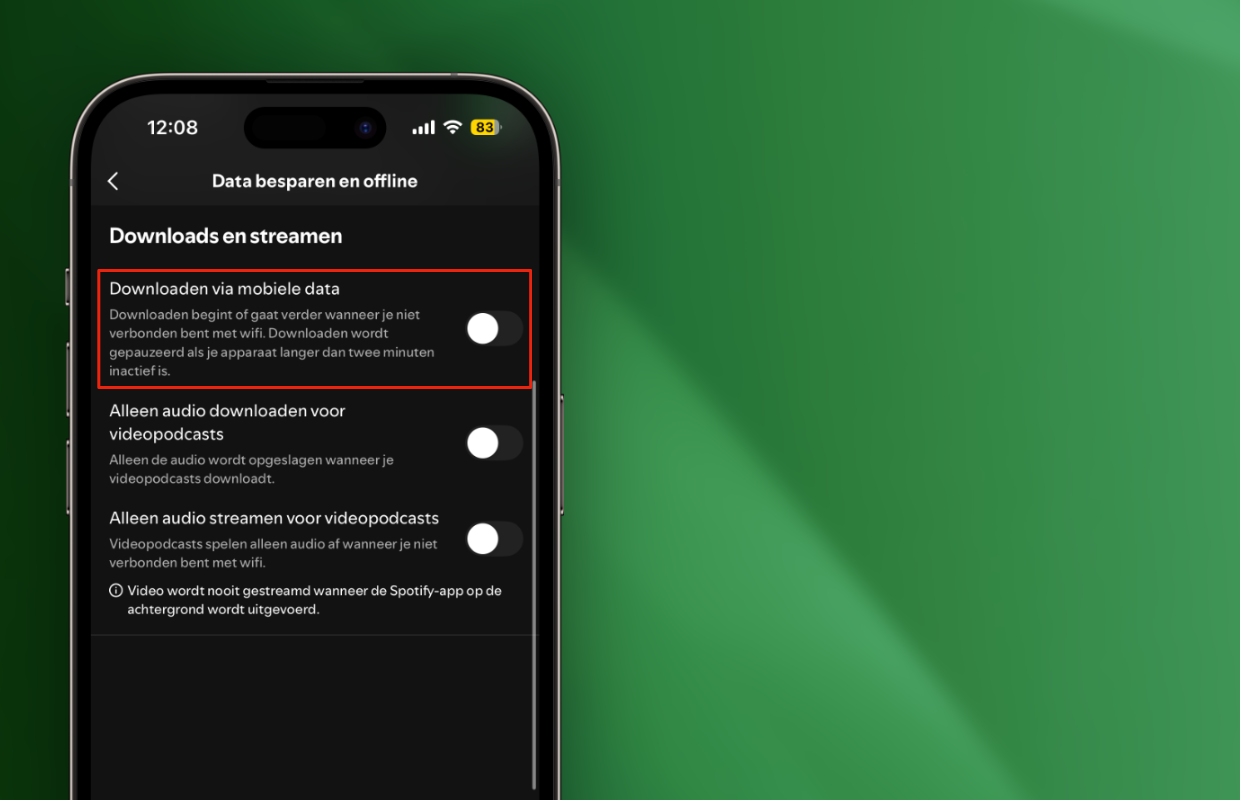 Daarbij moet je wel opletten dat deze downloads niet via het mobiele netwerk gebeuren. Bij de instellingen van Spotify kun je zelf kiezen op welke manier alle nummers, albums en podcasts worden opgeslagen. Het is belangrijk om downloads via het mobiele netwerk uit te schakelen, omdat je anders wél mobiele data verbruikt. Wil je voorkomen dat je onverwacht hoge mobiele kosten hebt? Zet de volgende functie dan uit in Spotify: