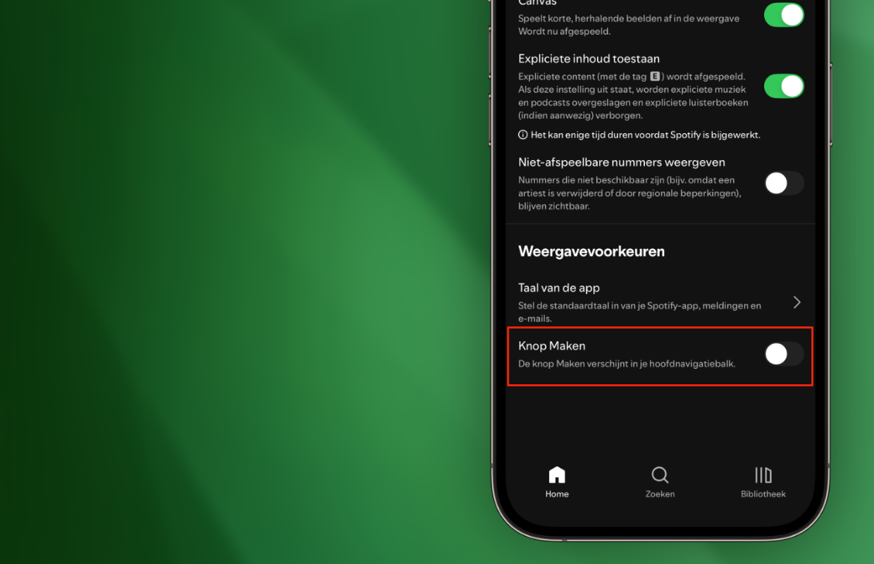 Met de Maken-knop kun je een afspeellijst, gezamenlijke playlist, Blend of Jam starten in Spotify. Gebruik je deze functies zelden? In dat geval is het handiger om de button in Spotify uit te schakelen. De Maken-knop staat op de plek waar je voorheen de snelkoppeling naar de Bibliotheek vond, waardoor je de button vermoedelijk snel per ongeluk aantikt. Zo voorkom je dat: