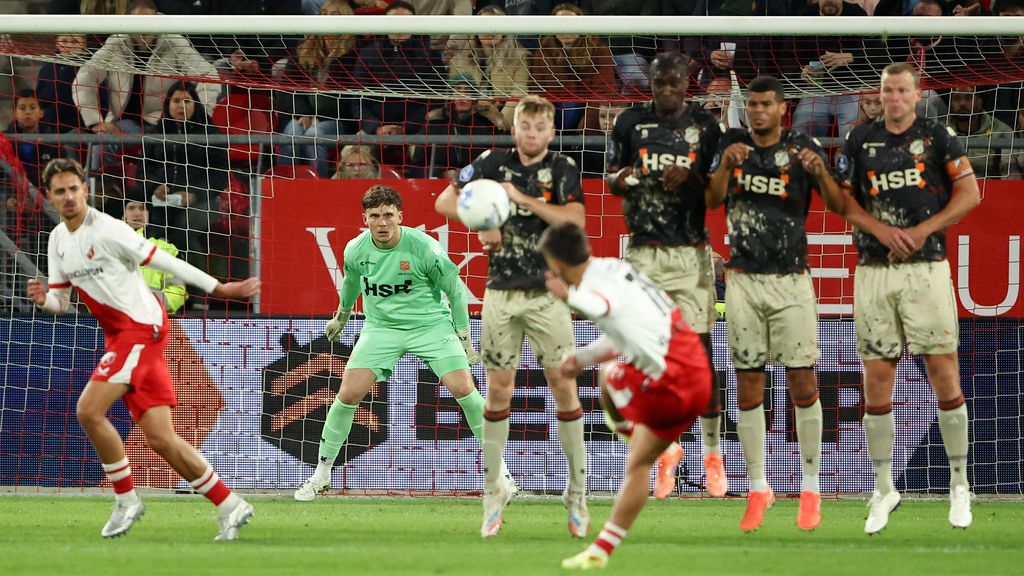Kayne van Oevelen houdt de 0-0 stand nog even op het bord met een geweldige redding. De 22-jarige keeper van FC Volendam vliegt naar de kruising en tikt daar een vrije trap van Souffian El Karouani weg.