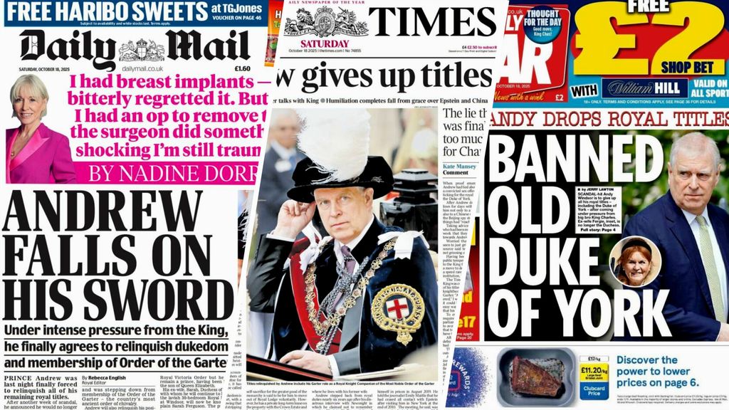 “De val van Andrew is compleet”, “Andrew valt in zijn eigen zwaard” en “De ondergang van de in ongenade gevallen hertog”. Het zijn enkele krantenkoppen in het Verenigd Koninkrijk op de dag na de bekendmaking van prins Andrew dat hij afstand doet van zijn koninklijke titels. Dat gebeurde onder zware druk van koning Charles en kroonprins William, stelt de Britse pers.