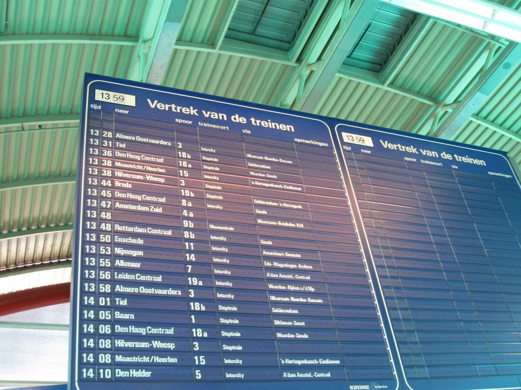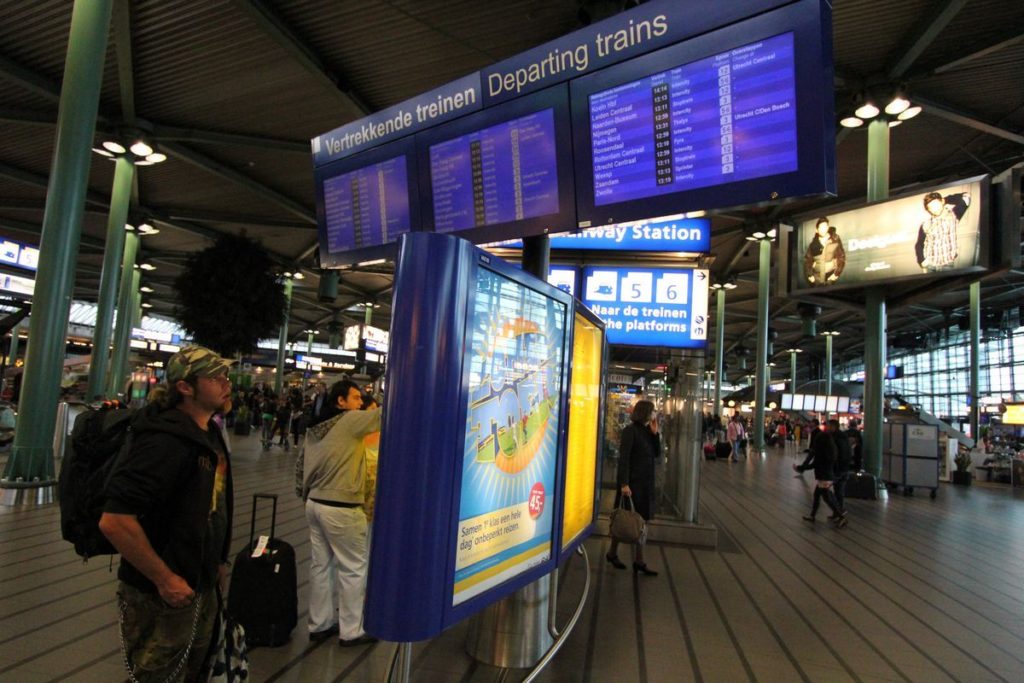 Helemaal nieuw is de donkere modus op digitale borden niet zoals hier op de archieffoto van station Schiphol Airport is te zien toen ProRail nog de reisinformatie leverde.