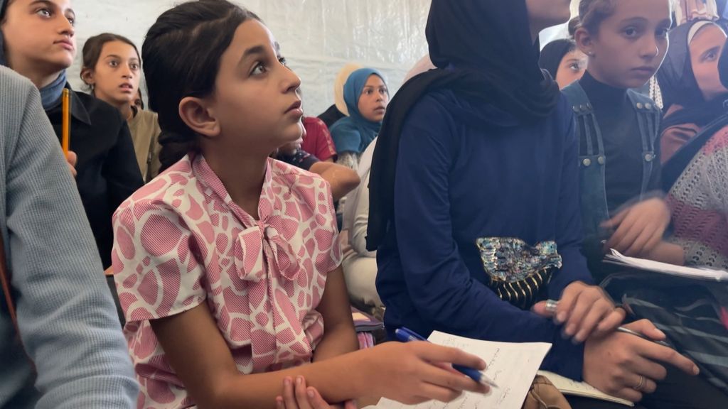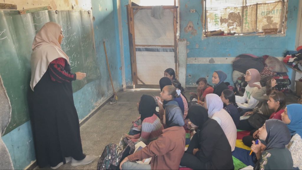 In Khan Younis, in het zuiden van Gaza, krijgt een aantal leerlingen al les. De ruimte is met een tentdoek opgedeeld in twee kamers, zodat er twee klaslokalen zijn om les in te kunnen geven. Tientallen kinderen zitten naast elkaar op de grond, terwijl de lerares met krijt op een schoolbord schrijft.
