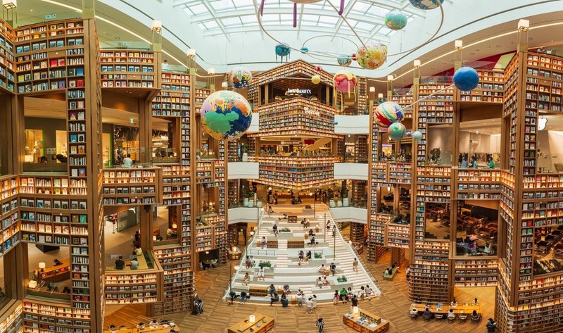 Een eeuwenoude boekencultuur is niet zomaar klein te krijgen door de digitalisering. Op de foto het walhalla voor boekenliefhebbers: Starfield Library Suwon in Zuid-Korea, een van ’s werelds grootste en mooiste bibliotheken.Jongeren hebben weinig met e-readers