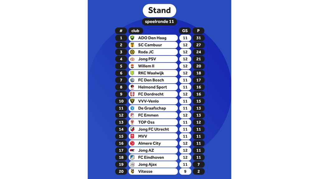 ADO liet dit seizoen pas één keer punten liggen, een 2-2 gelijkspel bij Jong Utrecht in speelronde twee. Sindsdien werd er louter gewonnen en ook het dit seizoen goed presterende Jong PSV kon daar geen verandering in brengen.