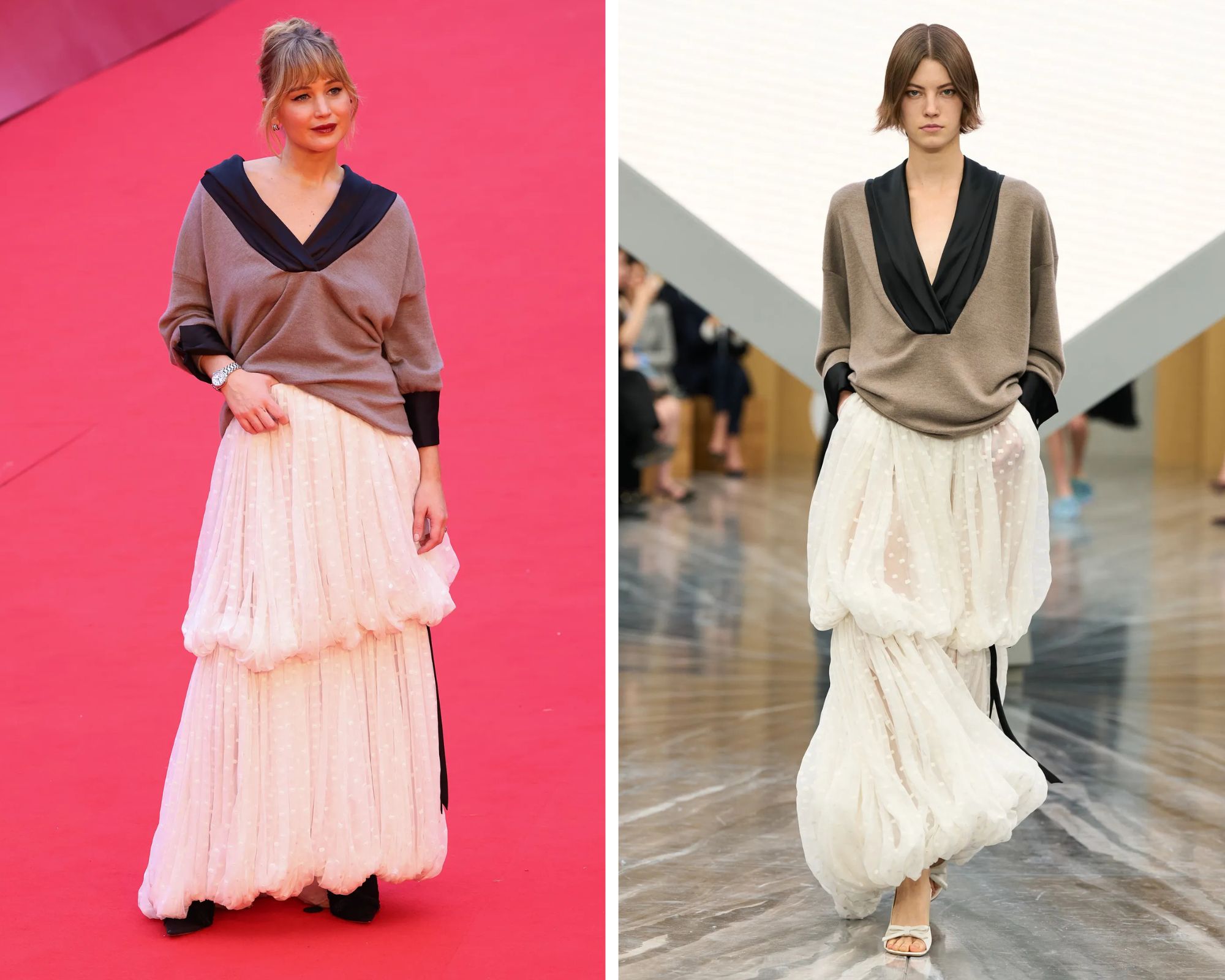 En toen arriveerde Lawrence op het filmfestival van Rome 2025, gekleed in Andersons visie op Dior. De actrice verscheen in look 56 van zijn lente/zomer 2026-collectie, namelijk een grijsbruine trui met zwarte manchetten en een bijpassende V-hals die over haar schouders was gedrapeerd. Als tegenhanger van de meer casual top droeg Lawrence een doorschijnende witte rok met stippen en een zwart lint dat de twee bubbelachtige lagen van elkaar scheidde.