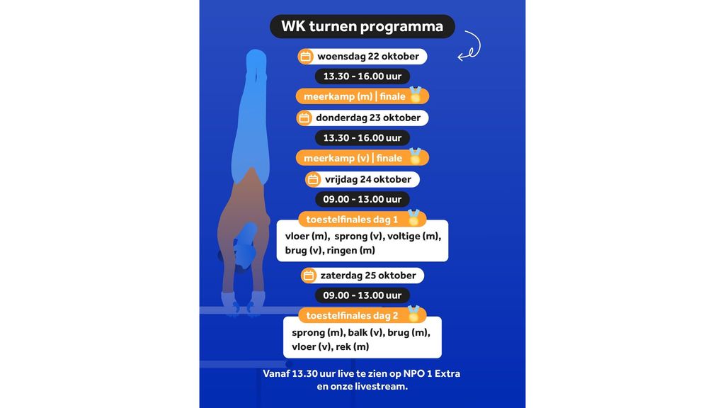 De WK turnen zijn vanaf woensdag 22 oktober live te zien bij de NOS, via een livestream op NOS.nl en in de NOS-app.