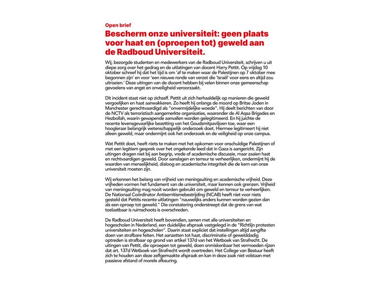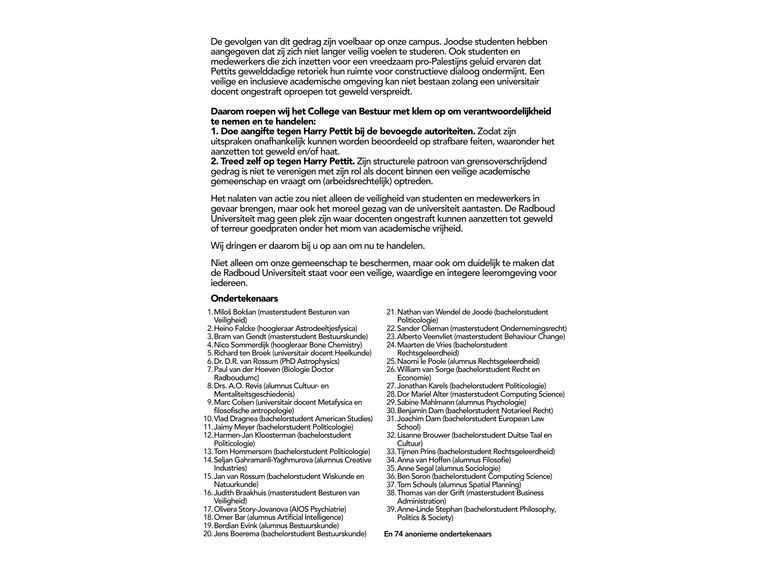 113 studenten, docenten, hoogleraren en medewerkers roepen de Radboud Universiteit in Nijmegen op om actie te ondernemen tegen docent Harry Pettit. Hij is omstreden vanwege zijn uitlatingen over Hamas en Israël.