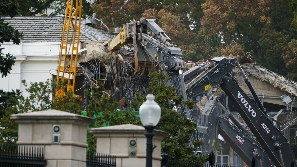 Het zicht op de werkzaamheden wordt geblokkeerd door schermen, maar vanuit het naastgelegen, hoge ministerie van Financiën is te zien hoe het historische gebouw deels in puin ligt. Ambtenaren kregen instructies geen beelden te delen, maar foto’s lekten uit naar The Washington Post. De geheimzinnigheid versterkt de zorgen over het gebrek aan transparantie.