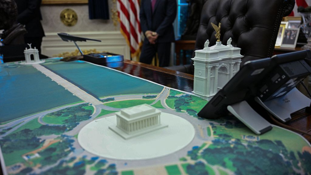 Volgens Trump is er zelfs geld over voor een triomfboog aan de rand van Washington. Trump toonde modellen in drie groottes en lijkt voor het grootste te gaan, dat forser is dan de Arc de Triomphe in Parijs. De boog wordt al de ‘Arc de Trump’ genoemd.