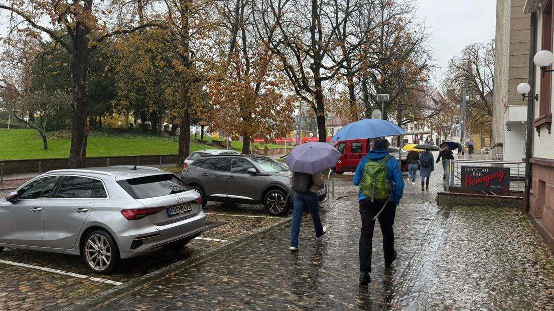 Het is wisselvallig in Duitsland, ook onderweg naar het zuiden. “De hele dag gaan de buien door en waait er een stevige zuidwestelijke wind”, zegt weervrouw Margot Ribberink. In Freiburg zelf is het niet veel beter. Mensen lopen er met paraplus en die ga je de hele dag nodig hebben.