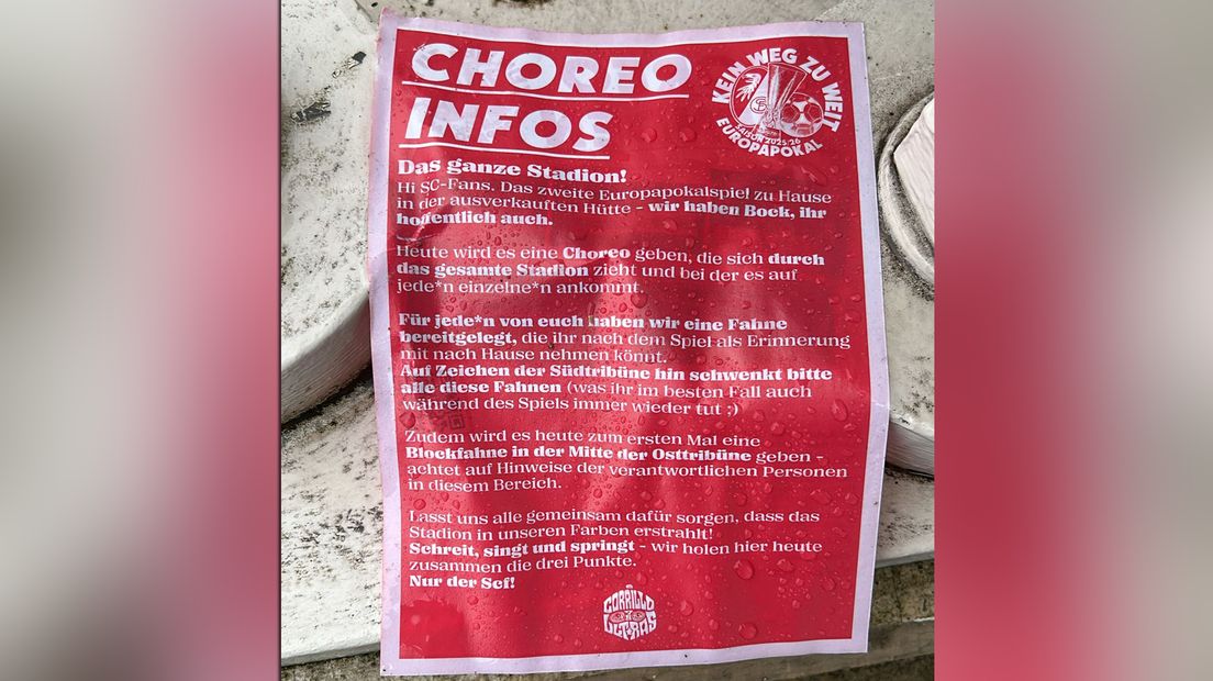 De supporters van SC Freiburg houden vanavond een sfeeractie in het stadion, zo staat te lezen op een info-blaadje. Op alle zijden van het stadion liggen vlaggen klaar én er is een flink spandoek op de Oosttribune. Supporters worden opgeroepen flink te zwaaien met de vlaggen. De supportersvereniging van Freiburg kan niet wachten: “Wir haben Bock, ihr hoffentlich auch” (Wij hebben er zin in, jullie hopelijk ook).