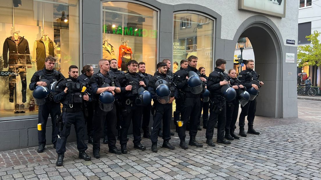 De Duitse politie laat zich steeds meer zien rond het pleintje voor de kroeg waar de Utrecht-supporters zich hebben verzameld. “Het is nu nog rustig en kalm”, laat een politievrouw weten. “Maar we zijn alert.”