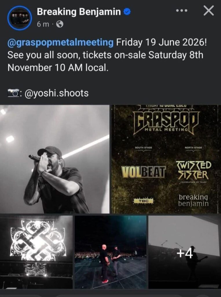 Breaking Benjamin plaatste een duidelijke post op social media. De band speelt op de vrijdag van Graspop Metal Meeting 2026 samen met headliners Volbeat en Twisted Sister. De kaartverkoop begint 8 november.
