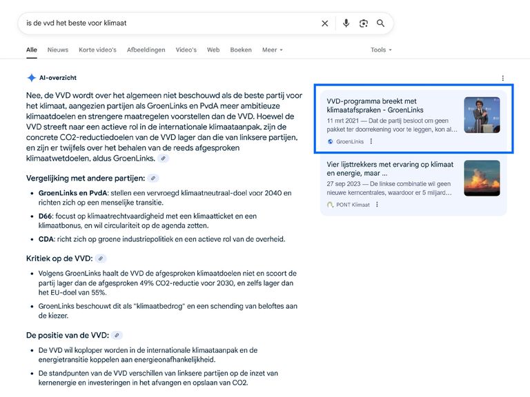 Partijwebsites, met name die van D66 en GroenLinks-PvdA, worden ook gebruikt als bron om antwoord te geven op vragen over andere partijen: dat gebeurde bij 344 vragen over specifieke partijen. Als bijvoorbeeld wordt gevraagd of de VVD “het beste is voor klimaat”, antwoordt Google op basis van informatie op de website van GroenLinks uit 2021.