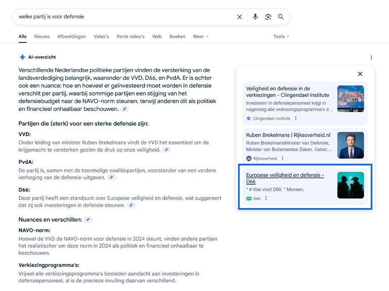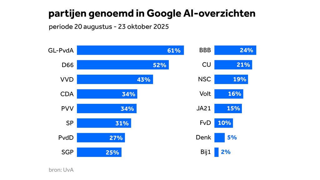 Wie op Google vragen stelt over politiek, krijgt in de AI-antwoorden vaker informatie te zien over de grotere partijen dan over kleinere partijen. Dat blijkt uit onderzoek van de Universiteit van Amsterdam (UvA). Vooral de partijen GroenLinks-PvdA en D66 komen vaker naar boven in de AI-antwoorden van de zoekmachine dan andere partijen. Ook zijn veel antwoorden gebaseerd op websites van politieke partijen, vooral die van GroenLinks-PvdA en D66.