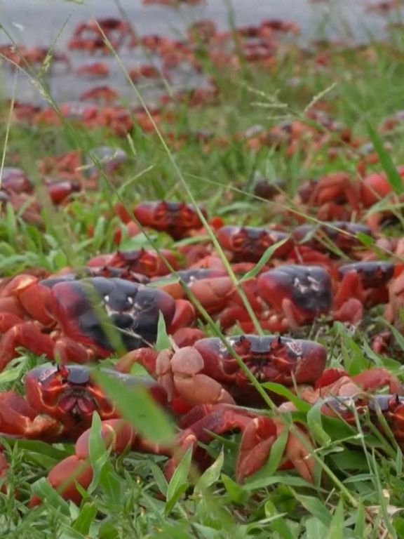 Miljoenen krabben zijn begonnen aan hun jaarlijkse trek over Kersteiland in Australië. Ze overspoelen de straten van het eiland.