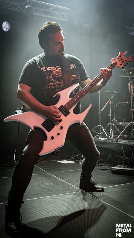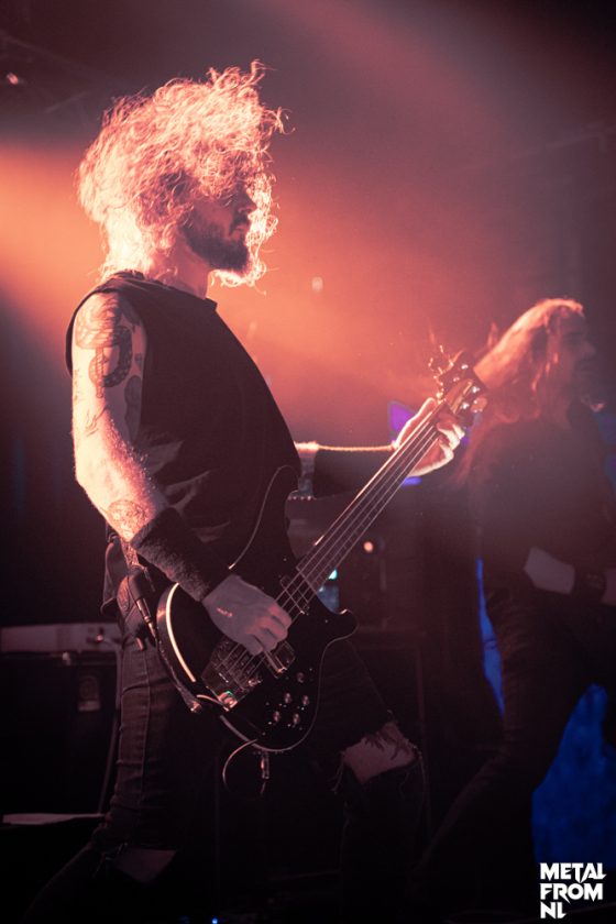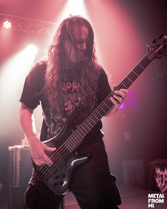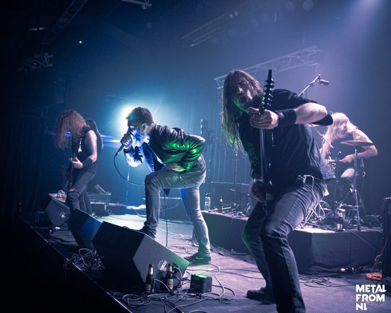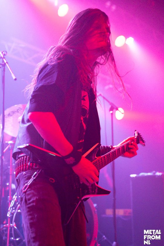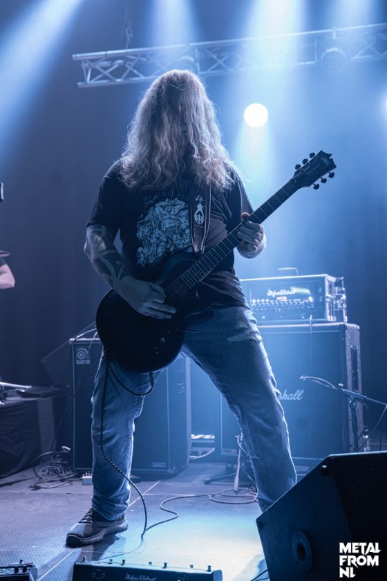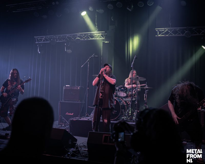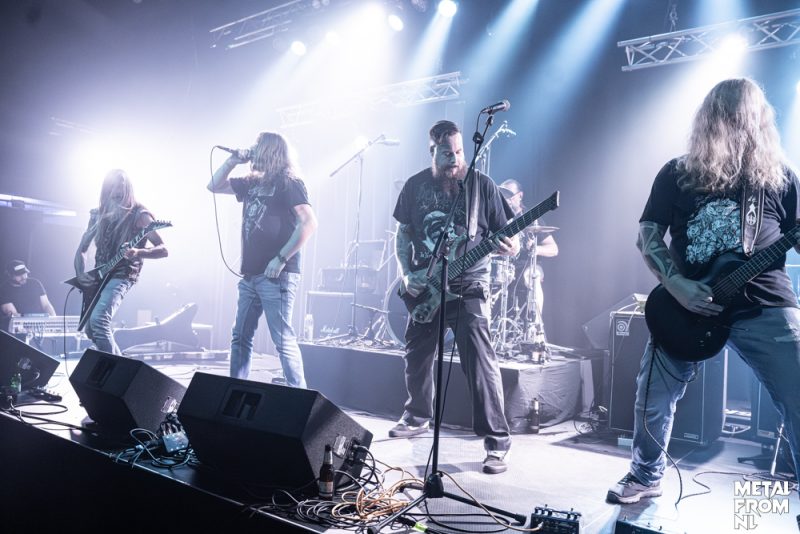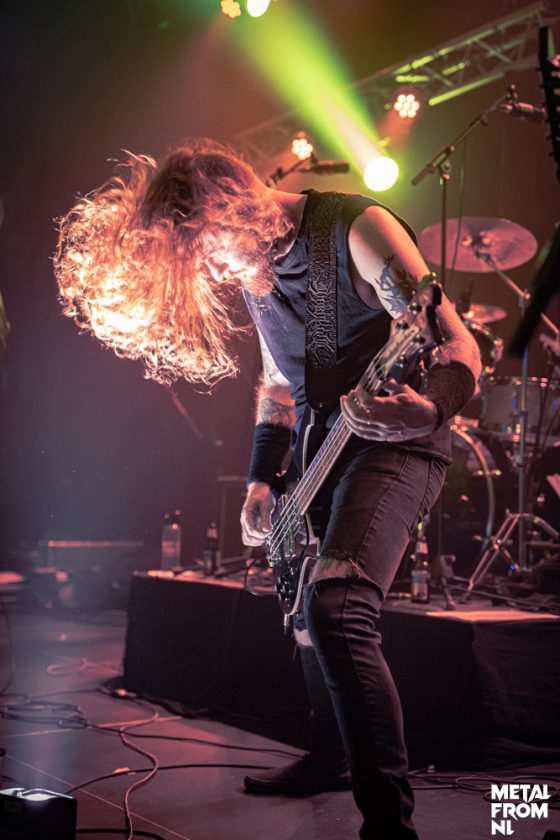 Mordkaul is de Vlaamse band van vanavond en het is duidelijk dat ze al heel wat podia versleten hebben. Helaas voor de band krijgen ze de meegebrachte lichtshow niet aan de praat en loopt de avond daardoor ook direct uit. De band is hier in de regio waarschijnlijk minder bekend dan de voorgaande bands en dat betekent dat ze het met de ‘Dutch Decease” moeten doen. Nederlands staan stil en bewegen hooguit met hun hoofd om aan te geven dat ze je muziek tof vinden. Tenzij ze je kennen, want dan is het pitten vanaf het eerste moment. Het lijkt voor de band weinig uit te maken: er wordt een hele professionele show neergezet, met glorieus headbangen van de bassist. Gaandeweg de set zien we steeds meer telefoons verschijnen die het optreden van de Vlamingen vastleggen: het wordt wel degelijk gewaardeerd! Terecht ook: het geluid is super goed, de nummers zijn sterk, zeker wanneer we bij The Widow Black wat Oosterse invloeden terug horen. De band komt binnenkort met een nieuw album, daarvan spelen ze vanavond alvast het titelnummer. Wat precies de titel was, ben ik helaas vergeten op te schrijven, maar dat ik het een vette track vond was zeker!