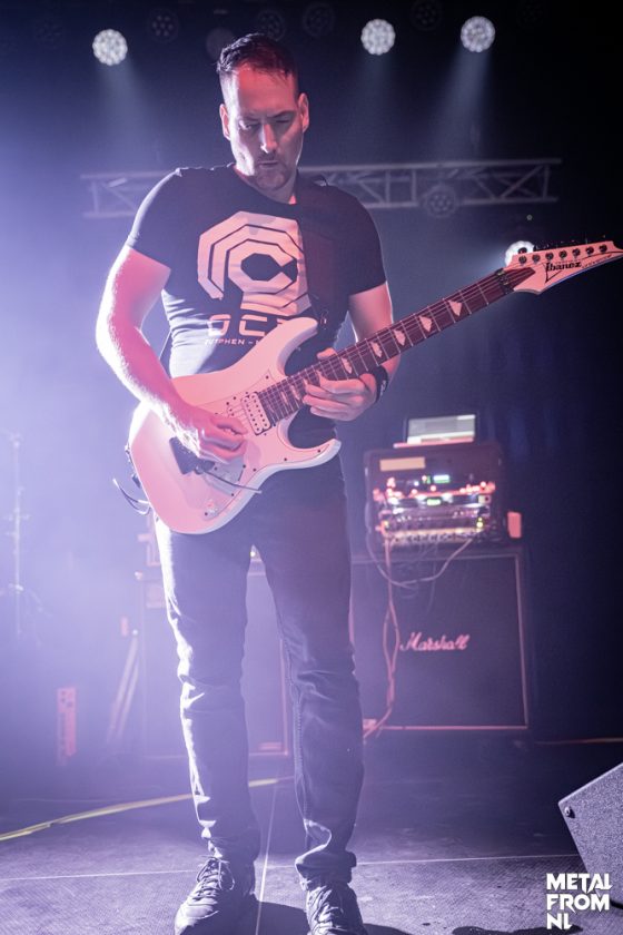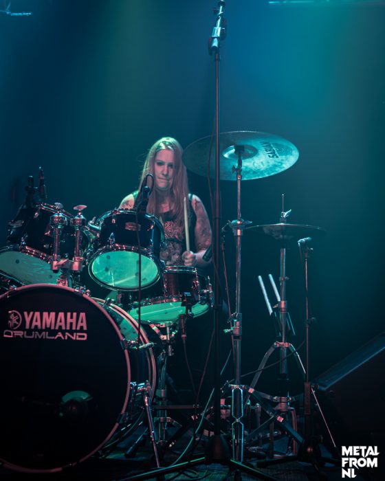 De eerste band van de avond is de band rondom gitarist Alex Mulder: Mutator. De heren en dame hebben net de debuutplaat uit, met trommelaar Nanda Mooij als nieuwste lid. Met dit Excessive Rage in de achterzak speelt de band vandaag vooral nieuwe nummers in hun half uur durende set. De band bestaat al wel wat langer, maar zoals nou eenmaal hoort in de scene – verschillende bandwisselingen maakten dat het nog even duurde voordat de plaat uitkwam en ze eindelijk op het podium konden verschijnen bij NH Metalfest. De band heeft duidelijk nog wat meer live-ervaring nodig, want er ontstaan af en toe toch wat ongemakkelijke stiltes, met name tijdens het omstemmen voor het laatste nummer van de set. Ook de interactie met het publiek is iets waar nog aan gewerkt kan worden: na een onwennige opkomst, duurt het twee nummers voordat de frontman iets tegen ons zegt. Dat gezegd hebbende; aan gitaar solo’s van Alex geen gebrek, al zijn het met name de melodische riffs van het oudere nummer Crystal Mountain waar ik vrolijk van wordt. Al zou het qua geluid geen kwaad kunnen om een tweede gitarist in dienst te nemen.