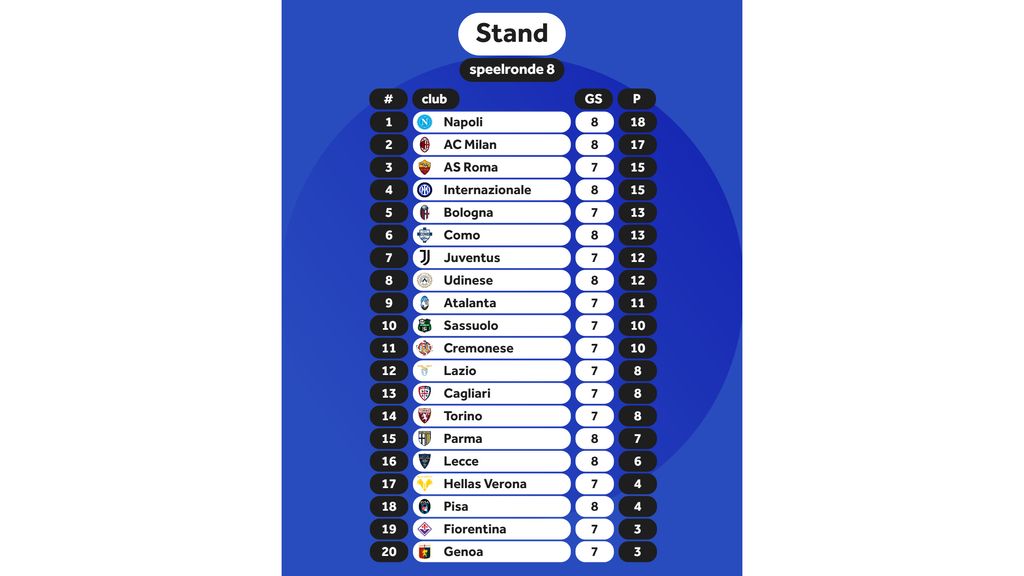 Door de zege profiteert Napoli optimaal van het puntenverlies van concurrent AC Milan. Die ploeg kwam eerder dit weekend niet verder dan een gelijkspel (2-2) tegen het gepromoveerde Pisa. De voorsprong op de nummer twee bedraagt één punt.
