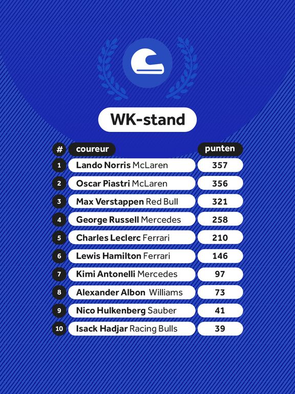 Norris loopt dus punten uit op Verstappen, maar die had vóór de race een grotere achterstand op Piastri, die andere McLaren-coureur die toen nog koploper was in de WK-stand. Verstappen stond voor aanvang van deze grand prix veertig punten achter op Piastri, terwijl de Nederlander nu 36 punten minder heeft dan Norris.