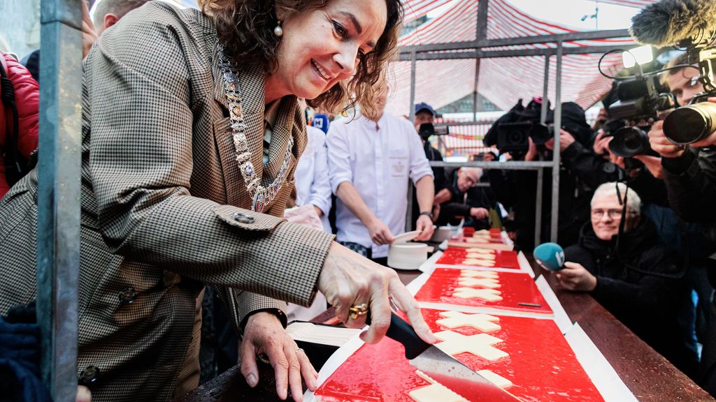 Ondanks het regenachtige weer stonden tientallen Amsterdammers klaar op de Dam voor een stukje gebak. De aanwezigen zongen ‘Lang zal ze leven’. De enorme taart met daarop de drie kruizen van de stad, wordt verdeeld in 7500 stukken en uitgedeeld onder inwoners van verschillende stadsdelen, schrijft AT5.