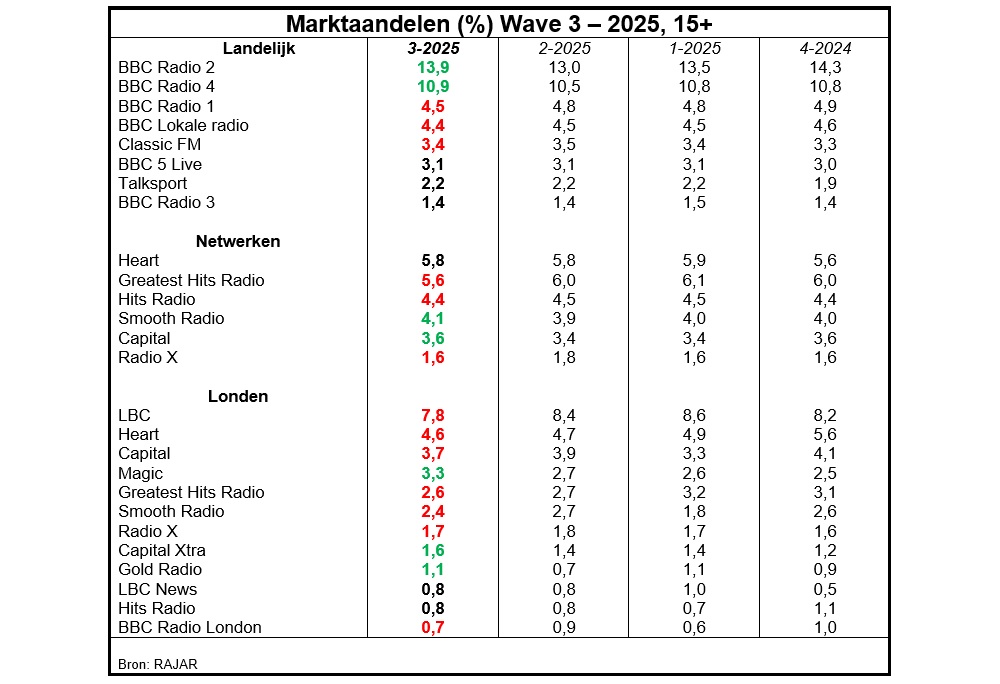 BBC Radio 2 zag het marktaandeel groeien naar 13,9% en blijft daarmee ‘The Nation’s Favorite’, gevolgd door BBC Radio 4 met 10,9% marktaandeel. Radio 1 kende een iets minder goed kwartaal en zag het marktaandeel dalen.