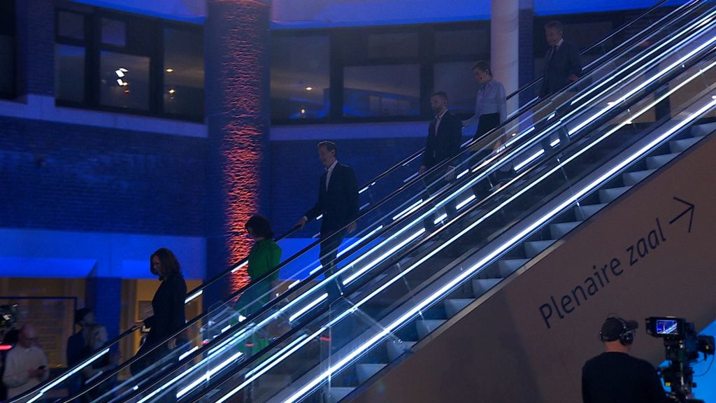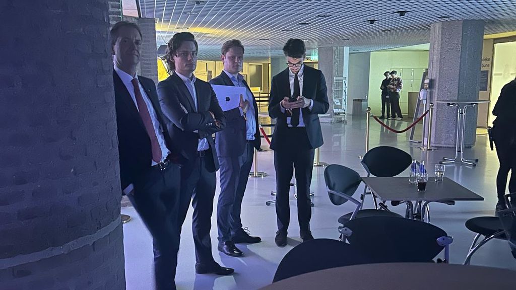 Kort voor het betreden van de Statenpassage van de Tweede Kamer maken de lijsttrekkers van de grotere partijen zich op voor hun debat. Achter de schermen wordt er nog even met elkaar gepraat. Daarna komen de lijsttrekkers via de roltrap naar beneden.