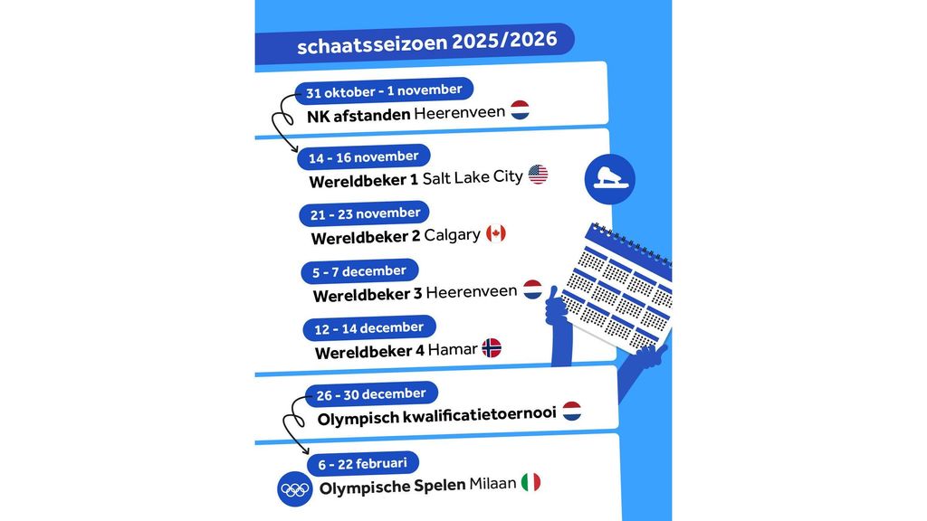 In dat geval wordt er gekeken naar de snelst gereden tijden van Nederlandse schaatsers, maar het maximale aantal van negen is niet meer te halen. Daarom is die eerste wereldbeker in Salt Lake City, op de snelste ijsbaan ter wereld, meteen cruciaal. “Daar gaat de hele wereld pieken”, klinkt het bij de schaatsbond.
