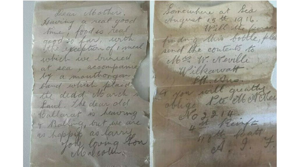 De handgeschreven briefjes in de fles waren van de destijds 27-jarige Malcolm Neville en de 37-jarige William Harley. Zij schreven hun boodschappen op zee op 15 augustus 1916, met potlood. Op dat moment voer hun schip “ergens in de Grote Australische Bocht”, staat op één van de briefjes.