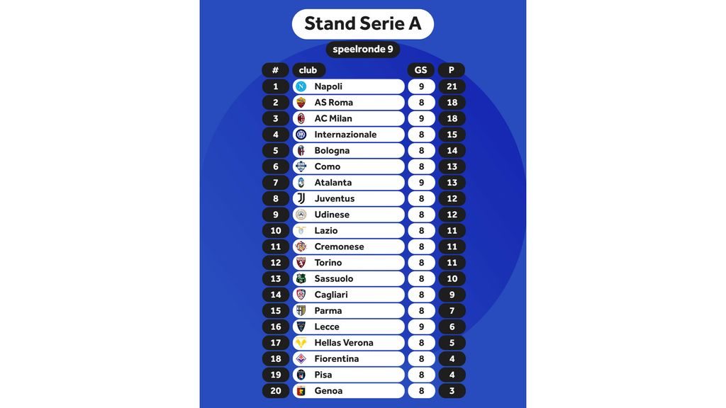 Door de zege komt Napoli op 21 punten. Dat zijn er 3 meer dan nummer twee AS Roma dat woensdagavond Parma op bezoek krijgt.