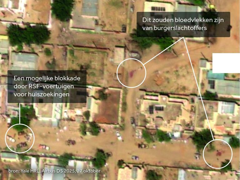 NOSOp deze satellietbeelden van een wijk in de Sudanese stad El-Fasher zouden bloedvlekken van burgerslachtoffers en RSF-voertuigen te zien zijn