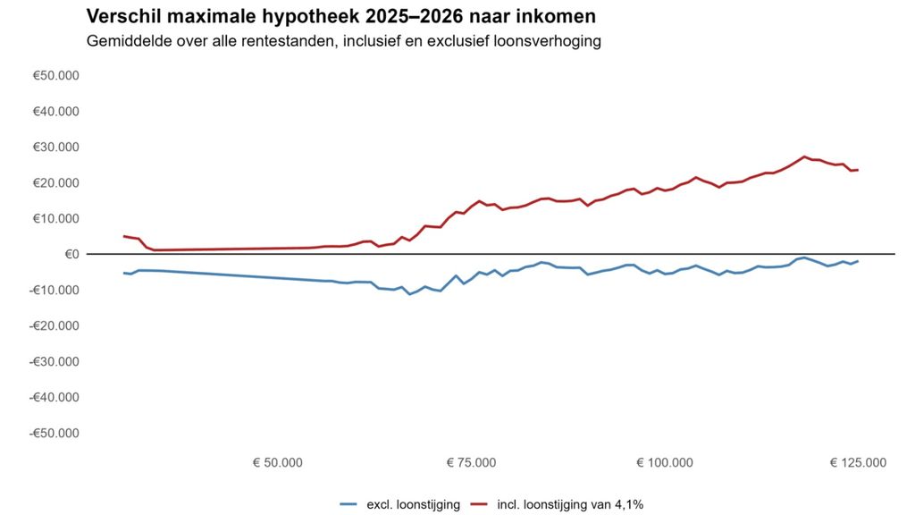 Bekijk hier hoeveel meer of minder je kan lenen volgend jaar, op basis van bruto jaarinkomen en wel of geen loonstijging: