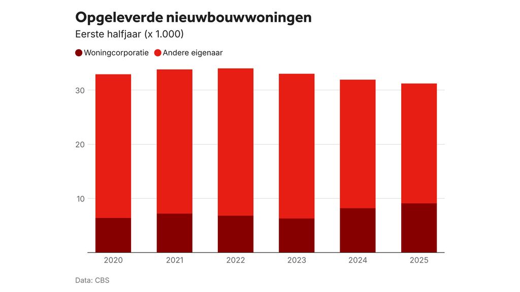 Sinds 2022 daalt het aantal nieuwbouwwoningen dat in de eerste helft van het jaar wordt opgeleverd, terwijl het aandeel corporatiewoningen juist stijgt. In 2023 was het nog 20 procent en nu dus bijna 30 procent.
