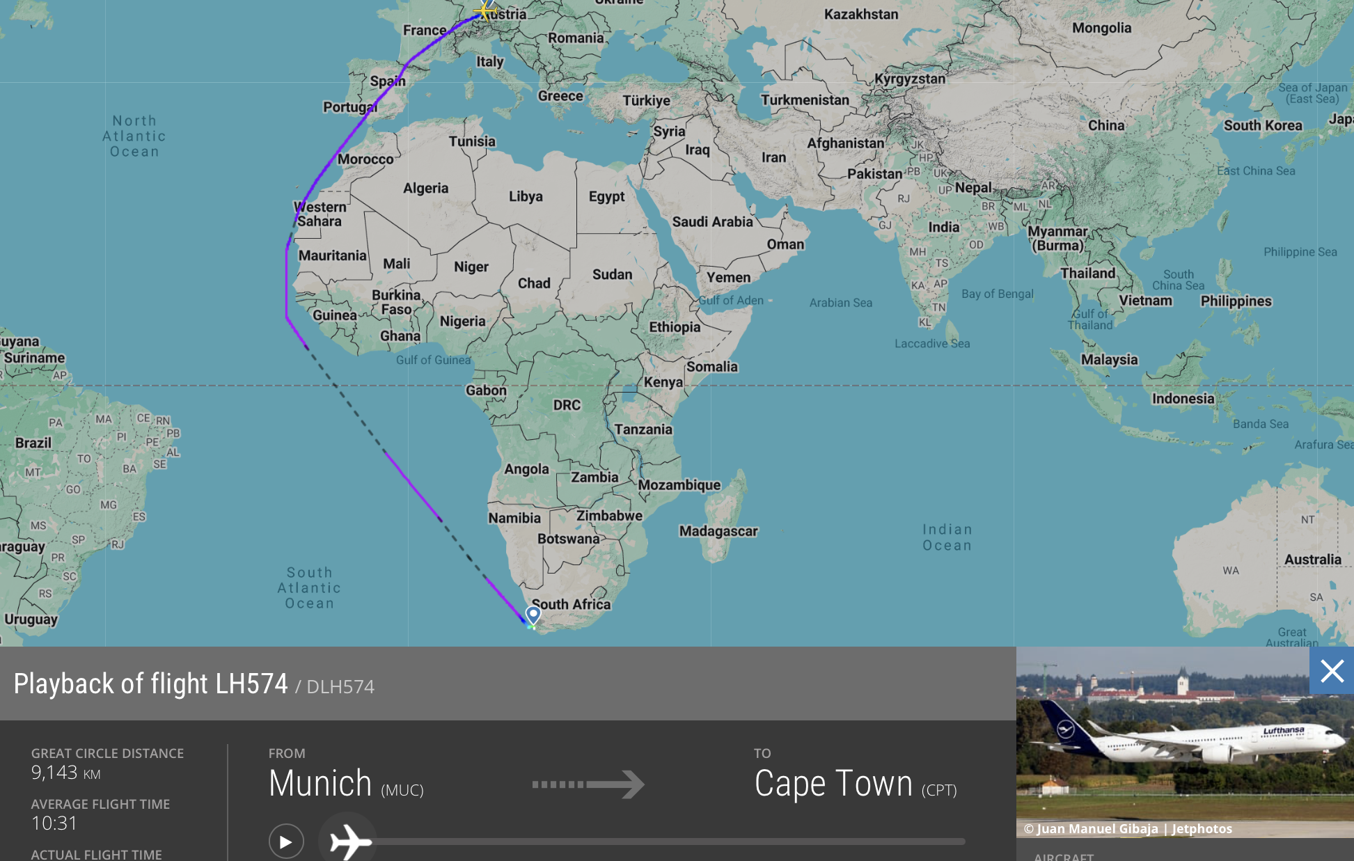 Vlucht LH574 uit München, daarentegen, deed er wat langer over. De A350 vloog via Frankrijk en Spanje langs de kust van Marokko, West-Afrika en over een groot stuk van de Atlantische Oceaan naar haar bestemming in Zuid-Afrika. Pas na dertien uur en vijf minuten landde het vliegtuig in Kaapstad, ruim twee en een half uur later dan normaal.