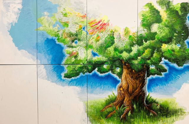 Het Nederlands Mijnmuseum ruimde een deel van haar bovenste verdieping leeg voor Rooted in Change. Directeur Roels: „Onder meer voor werken die een directe relatie hebben met de mijnen. Bijvoorbeeld een schilderij van Jan Laeven met koeltorens tegen een abstracte, bijna kubistisch aandoende lucht. Een deel van dat soort kunst is ook verdwenen, omdat medewerkers in de mijntijd soms iets mochten uitkiezen.”