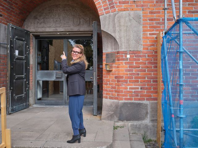 Defne Ayas in gesprek met de beveiliging van het Van Abbe Museum.