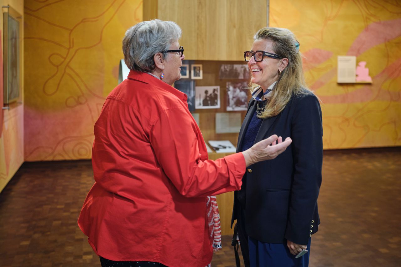 Defne Ayas, directeur van het Van Abbemuseum, in gesprek met een vrijwilliger.