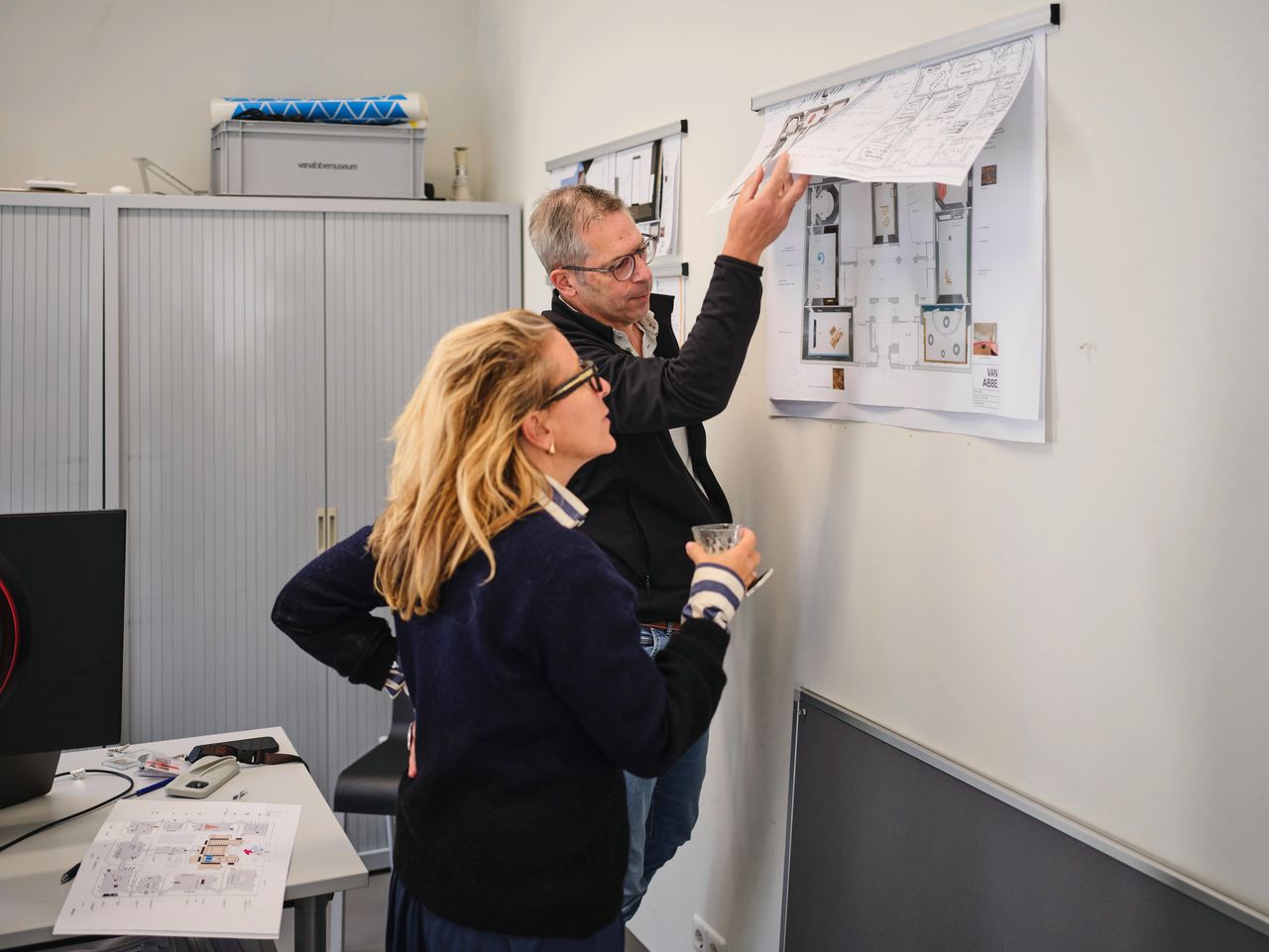 De dag begint met een overleg over de verbouwing. We stellen bij, reageren collectief. De plannen: nieuw entreegebied, presentatie, oriëntatie.