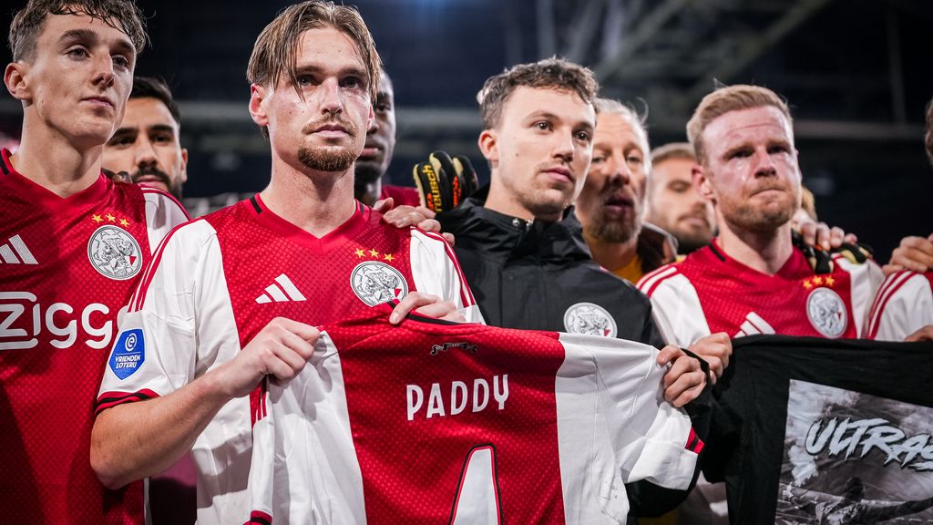Pro ShotsSpelers van Ajax tonen na afloop een shirt met de naam ‘Paddy’ aan de supporters