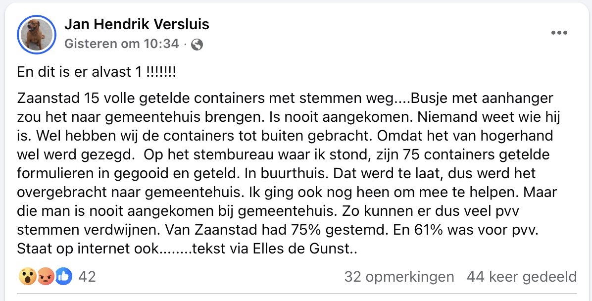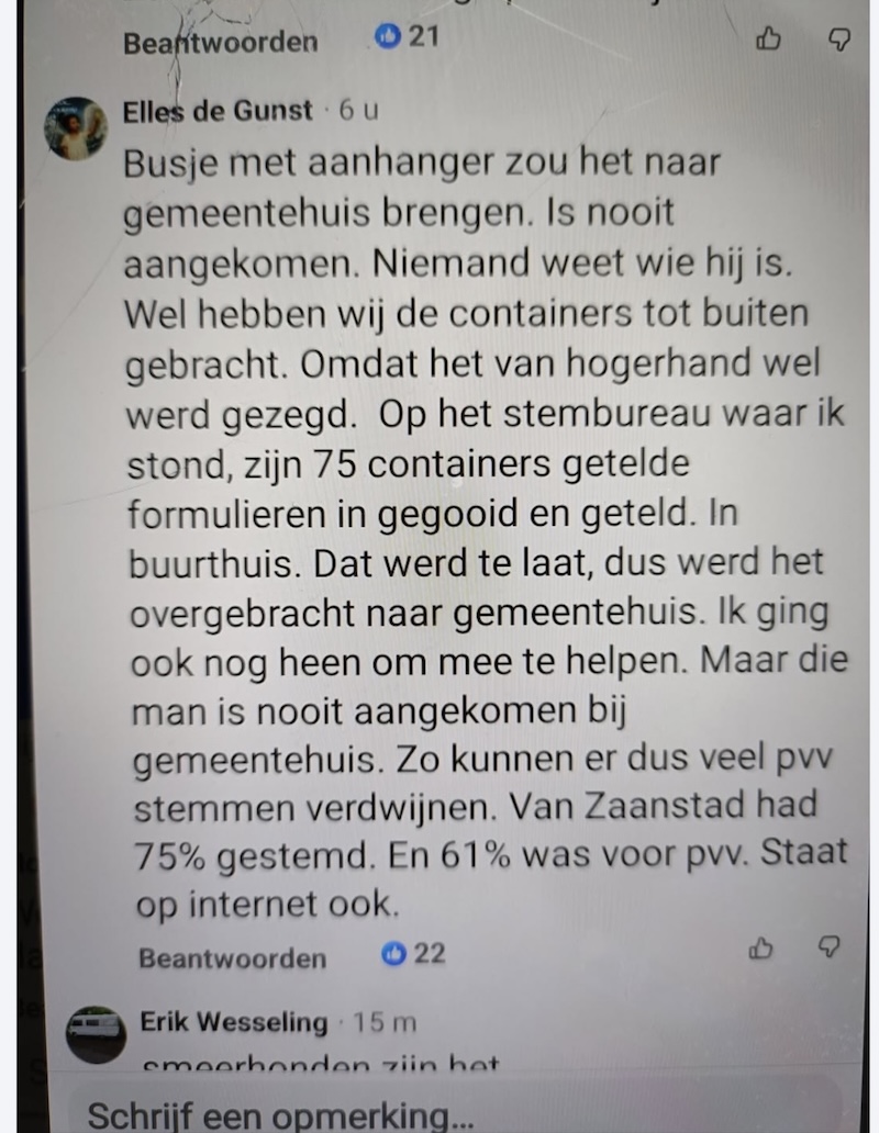 Het bericht dook gistermorgen op Facebook bij verschillende accounts op, de schrijver zou het via ene Elles Gunst hebben gehoord. Die bestaat niet (zie UPDATE), net zoals er geen 75 containers nodig zijn voor de stembiljetten van één stembureau of dat er 61 procent PVV-stemmers in Zaanstad zijn (dat waren er 18,2 procent). Op Facebook zelf wordt het bericht flink gesteund: ‘vuile ratte in Den Haag’, ‘en weer is er !! fraude gepleegd stembiljetten zijn niet aangekomen (hele kliko’s)’, ‘zeker niet onmogelijk’.