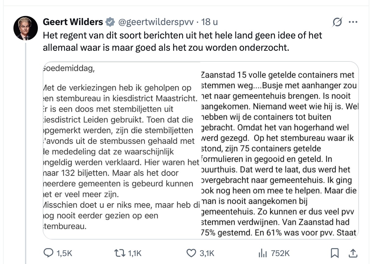 En hij kan het weten. Een paar uur daarvoor stuurde de PVV-voorman een tweet naar zijn volgers met daarin beschuldigingen over 15 (van de 75) uit een buurthuis verdwenen containers in Zaanstad (met 61% PVV-stemmen) en Leidse stembiljetten die in Maastricht zouden zijn opgedoken. Zonder bron, zonder bewijs maar vol aantoonbare onzin: