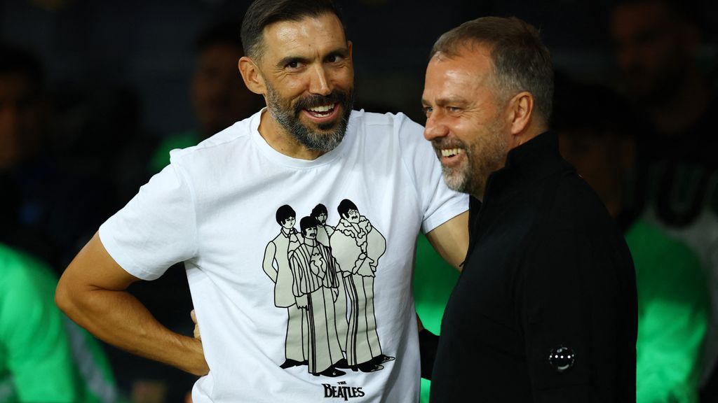 ReutersElche-trainer Eder Sarabia, in Beatles-shirt, lacht met Barcelona-coach Hansi Flick.