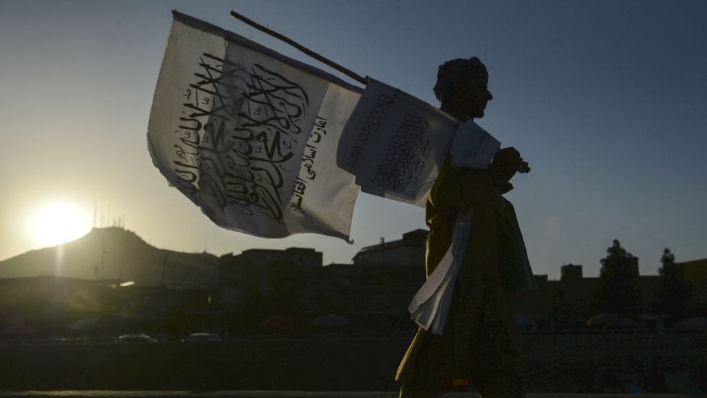 AFPEen man verkoopt in Kabul Taliban-vlaggen, op 15 september 2021, de dag van de machtsovername door de Taliban