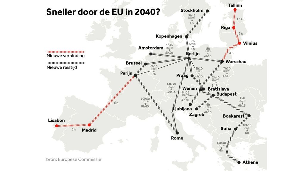 In 4 uur met een hogesnelheidstrein van Berlijn naar Kopenhagen, en in 6 uur van Parijs naar Madrid. Het is nu nog onmogelijk, maar de Europese Commissie komt vandaag met een actieplan dat deze droom in 2040 werkelijkheid moet maken.