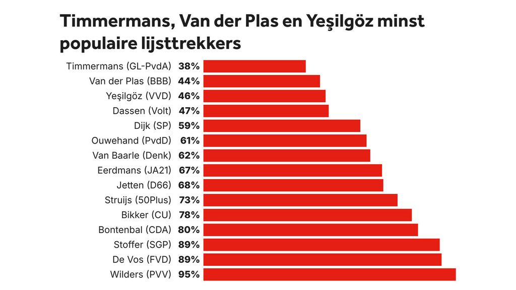 Ook Caroline van der Plas van BBB (44 procent), Dilan Yeşilgöz van de VVD (46 procent) en Laurens Dassen van Volt (47 procent) kregen relatief weinig steun. Dat is een groot contrast met de PVV, waar Geert Wilders op 95 procent uitkwam, met meer dan 1,7 miljoen stemmen.